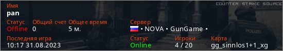 Играет на Counter Strike Source сервере. Страна: РоссияПервый раз замечен 10:15 31.08.2023