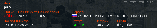 Последний раз был в сети 14:16 19.05.2025 Игрок с таким ником замечен на 17 серверах