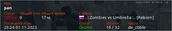 Последний раз был в сети 23:24 01.11.2023 Игрок с таким ником замечен на 17 серверах