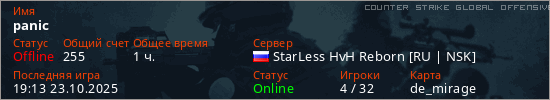 Играет на Counter Strike Global Offensive сервере. Страна: РоссияПервый раз замечен 21:29 02.10.2025