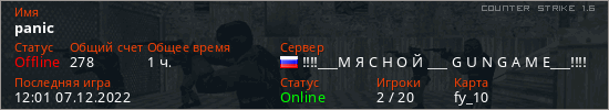 Играет на Counter Strike 1.6 сервере. Страна: РоссияПервый раз замечен 10:08 01.12.2022