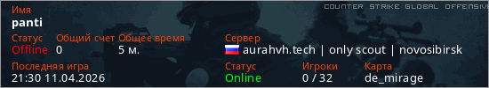 Играет на Counter Strike Global Offensive сервере. Страна: РоссияПервый раз замечен 21:19 11.04.2026