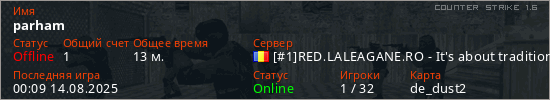 Играет на Counter Strike 1.6 сервере. Страна: РумынияПервый раз замечен 23:42 11.06.2025
