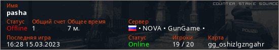 Играет на Counter Strike Source сервере. Страна: РоссияПервый раз замечен 16:24 15.03.2023