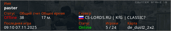 Играет на Counter Strike 1.6 сервере. Страна: РоссияПервый раз замечен 21:59 17.02.2025