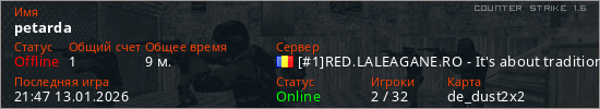 Играет на Counter Strike 1.6 сервере. Страна: РумынияПервый раз замечен 21:36 13.01.2026