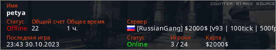Играет на Counter Strike Source сервере. Страна: РоссияПервый раз замечен 13:36 01.10.2023