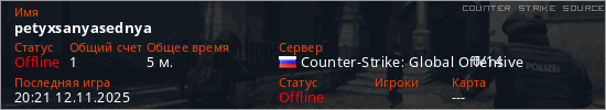 Играет на Counter Strike Source сервере. Страна: РоссияПервый раз замечен 20:16 12.11.2025