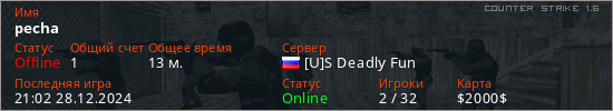 Играет на Counter Strike 1.6 сервере. Страна: РоссияПервый раз замечен 22:39 06.04.2024