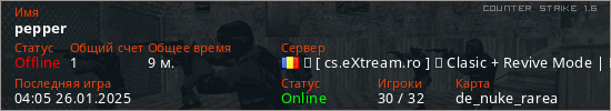 Играет на Counter Strike 1.6 сервере. Страна: РумынияПервый раз замечен 00:30 03.11.2024