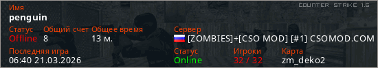 Играет на Counter Strike 1.6 сервере. Страна: РоссияПервый раз замечен 07:05 20.03.2026