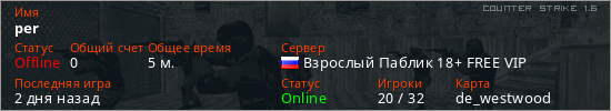 Играет на Counter Strike 1.6 сервере. Страна: РоссияПервый раз замечен 22:06 11.01.2026