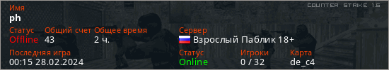 Последний раз был в сети 00:15 28.02.2024 Игрок с таким ником замечен на 17 серверах