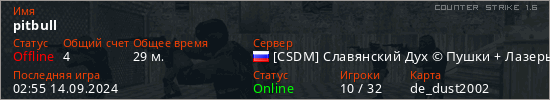 Играет на Counter Strike 1.6 сервере. Страна: РоссияПервый раз замечен 01:04 22.07.2024