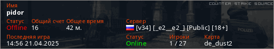 Играет на Counter Strike Source сервере. Страна: РоссияПервый раз замечен 20:54 26.02.2024