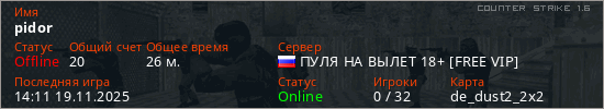 Играет на Counter Strike 1.6 сервере. Страна: РоссияПервый раз замечен 20:45 01.08.2025