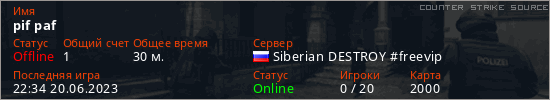 Играет на Counter Strike Source сервере. Страна: РоссияПервый раз замечен 19:21 18.06.2023