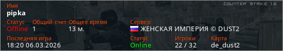 Играет на Counter Strike 1.6 сервере. Страна: РоссияПервый раз замечен 10:28 11.02.2026