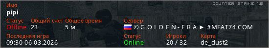 Играет на Counter Strike 1.6 сервере. Страна: РоссияПервый раз замечен 08:48 06.03.2026