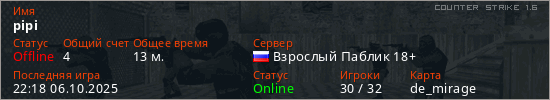 Играет на Counter Strike 1.6 сервере. Страна: РоссияПервый раз замечен 10:57 05.02.2024