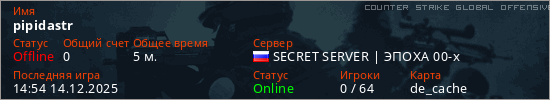 Играет на Counter Strike Global Offensive сервере. Страна: РоссияПервый раз замечен 14:46 14.12.2025