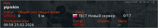Играет на Counter Strike 1.6 сервере. Страна: РоссияПервый раз замечен 09:56 25.02.2026