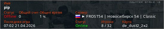 Играет на Counter Strike 1.6 сервере. Страна: РоссияПервый раз замечен 15:17 13.04.2026