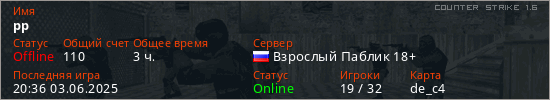 Играет на Counter Strike 1.6 сервере. Страна: РоссияПервый раз замечен 15:59 01.01.2021