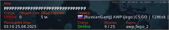 Играет на Counter Strike Global Offensive сервере. Страна: РоссияПервый раз замечен 02:43 25.08.2025