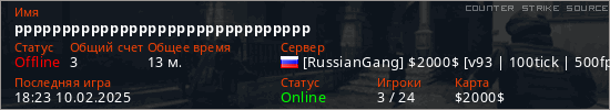 Играет на Counter Strike Source сервере. Страна: РоссияПервый раз замечен 16:58 25.10.2024
