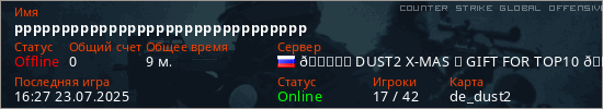 Играет на Counter Strike Global Offensive сервере. Страна: РоссияПервый раз замечен 16:02 23.07.2025