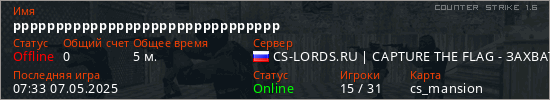 Играет на Counter Strike 1.6 сервере. Страна: РоссияПервый раз замечен 07:31 07.05.2025