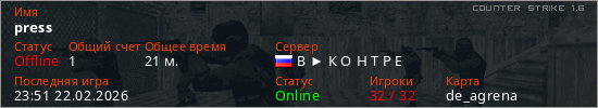 Играет на Counter Strike 1.6 сервере. Страна: РоссияПервый раз замечен 01:36 10.02.2026