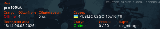 Играет на Counter Strike Global Offensive сервере. Страна: УкраинаПервый раз замечен 17:39 06.03.2026
