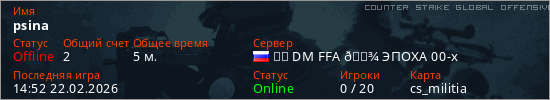 Играет на Counter Strike Global Offensive сервере. Страна: РоссияПервый раз замечен 14:46 22.02.2026