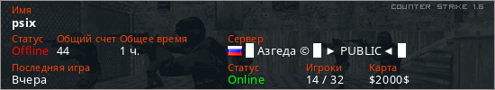 Играет на Counter Strike 1.6 сервере. Страна: РоссияПервый раз замечен 12:54 16.03.2026