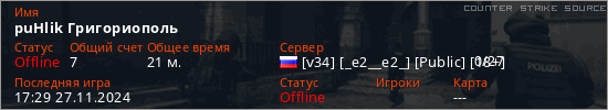 Играет на Counter Strike Source сервере. Страна: РоссияПервый раз замечен 16:11 15.04.2024