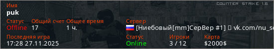 Последний раз был в сети 17:28 27.11.2025 Игрок с таким ником замечен на 27 серверах