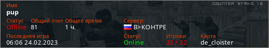 Играет на Counter Strike 1.6 сервере. Страна: РоссияПервый раз замечен 10:14 14.07.2022