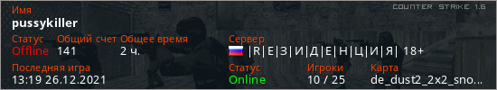 Играет на Counter Strike 1.6 сервере. Страна: РоссияПервый раз замечен 21:23 22.08.2020