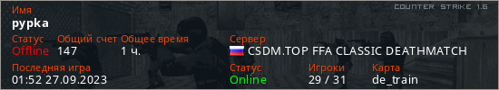 Играет на Counter Strike 1.6 сервере. Страна: РоссияПервый раз замечен 20:54 01.06.2020