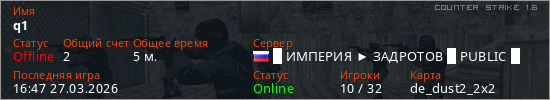 Играет на Counter Strike 1.6 сервере. Страна: РоссияПервый раз замечен 16:43 27.03.2026