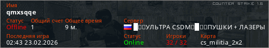 Играет на Counter Strike 1.6 сервере. Страна: РоссияПервый раз замечен 23:54 17.02.2026