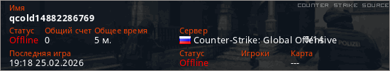 Играет на Counter Strike Source сервере. Страна: РоссияПервый раз замечен 19:09 25.02.2026