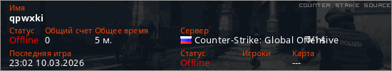 Играет на Counter Strike Source сервере. Страна: РоссияПервый раз замечен 22:50 10.03.2026