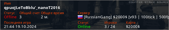 Играет на Counter Strike Source сервере. Страна: РоссияПервый раз замечен 21:44 19.10.2024