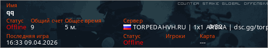 Играет на Counter Strike Global Offensive сервере. Страна: РоссияПервый раз замечен 16:31 09.04.2026