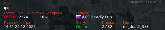 Играет на Counter Strike 1.6 сервере. Страна: РоссияПервый раз замечен 18:47 03.08.2021