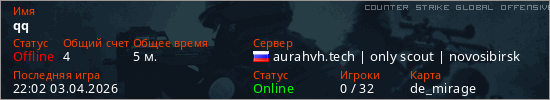 Играет на Counter Strike Global Offensive сервере. Страна: РоссияПервый раз замечен 21:27 03.04.2026