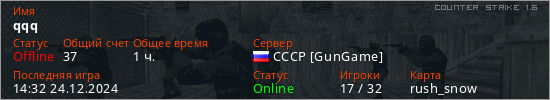 Играет на Counter Strike 1.6 сервере. Страна: РоссияПервый раз замечен 07:48 07.05.2023